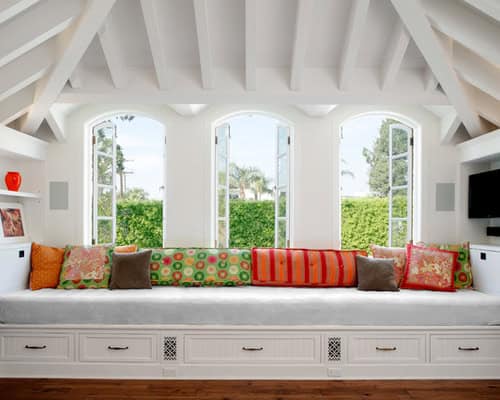 This home office loft features painted ceiling beams, arched windows, built-in bookshelves and a custom window seat covered in eclectic pillows.