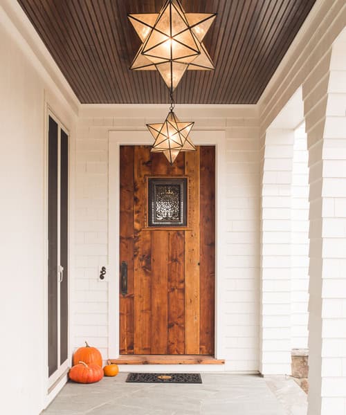 1. The metal details and rich wood tones of this salvaged door create an entry that’s just as vivid as one in a bright color. Moravian star pendants line the walkway.