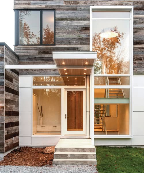 3. The projection of this front door’s overhang and concrete stoop instills a feeling of movement, even though everything is standing still. The glass door blends with the expansive glass of the entry windows.