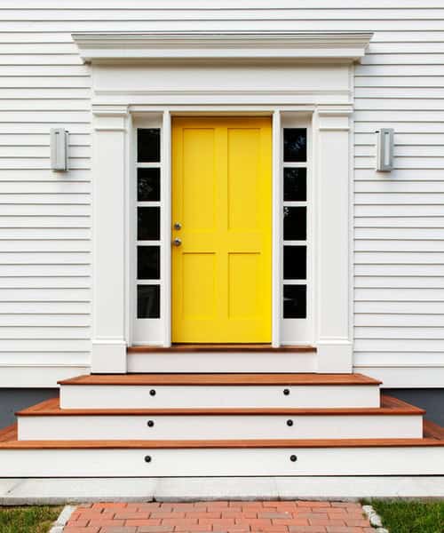 4. This cheery farmhouse entrance features mahogany steps and a bright yellow door that strikingly contrasts the crisp white siding.