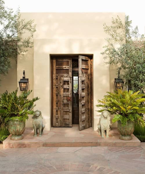 5. A vintage door from Central America marks the entrance to this Mediterranean home in San Diego. Matching lanterns, sculpture and potted plants enhance the elegant entry.