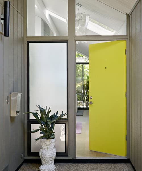 7. Designer Alison Damonte bought this owl umbrella stand at a flea market and repurposed it as a planter for a staghorn fern. The lime front door invites visitors into a colorful Eichler home, which is in the San Francisco Bay Area.