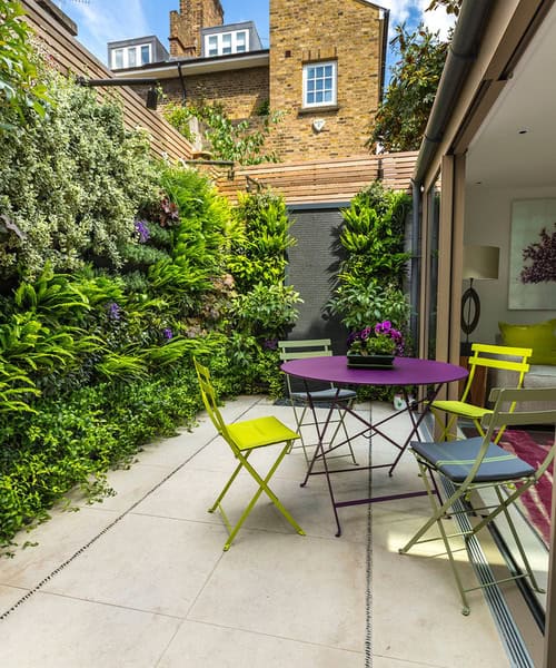 5. Living green. Explore otherwise empty vertical space in a small courtyard with high walls. Here, layers of wall-mounted troughs are filled to the brim with foliage to create a vertical garden. Outside lights on long arms ensure that the display is just as stunning after hours.