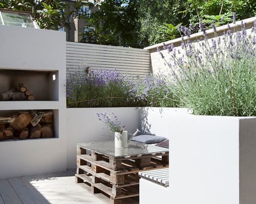 7. Mediterranean magic. Raised walls make use of the available space in this cute courtyard. There’s even an inset fireplace to warm up chilly evenings. Masses of lavender create a fragrant oasis, while a pile of pallets, smartened up with a custom glass top, is used as a rustic table for the cozy corner bench.