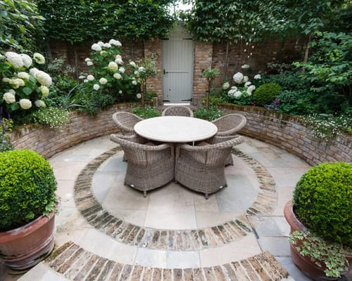 8. Beautiful brick. An old brick wall brightened by flowers and warmed by the sun makes a pleasing setting for outdoor dining. This charming garden keeps things simple with ‘Annabelle’ hydrangeas and neat boxwood balls in terra-cotta pots.
