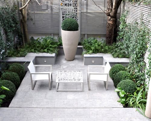 3. Monochrome color. An all-gray palette lets lush greenery take center stage in this courtyard retreat. Walls and fences painted the same shade, with matching paving, make the garden’s boundaries one with the design.