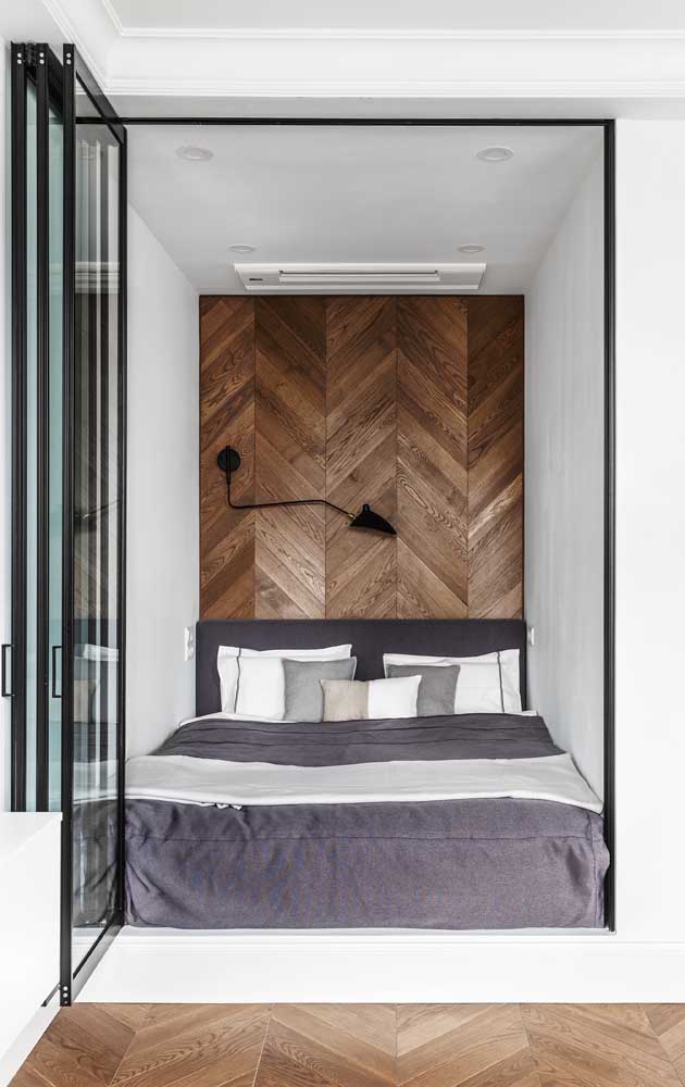 The head of the small double bedroom should preferably be placed horizontally to create a greater sense of space. Another tip is to place mirrors on the remaining part of the headboard wall, besides being beautiful, the mirrors help to enlarge the environment.