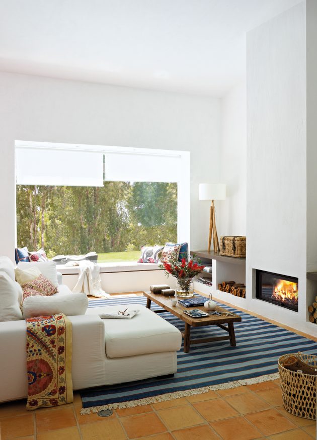 Fresh, light, modern, summery … This is how this room is decorated in white and with blue as a contrasting color. The piece of furniture that integrates the fireplace and the bench under the window reinforces this Mediterranean flavor.