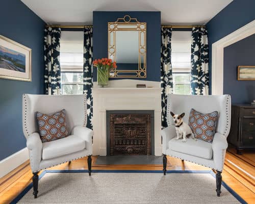 1. Well rested and cheerful. “The blues” gives the color blue a bad reputation. In this inviting bedroom sitting area, blue creates a wonderful environment in which to transition from sleep mode to being ready to meet the day. Conversely, it’s a great place for enjoying the last embers in the fireplace and getting sleepy with a good book at night.