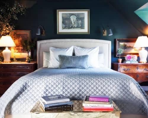 4. Dreamy. This deep bluish-green-gray hue is not only peaceful and inspiring, but it mitigates the complications of all of the angles in the room. The bedroom inspires a good night’s rest and pleasant dreams.