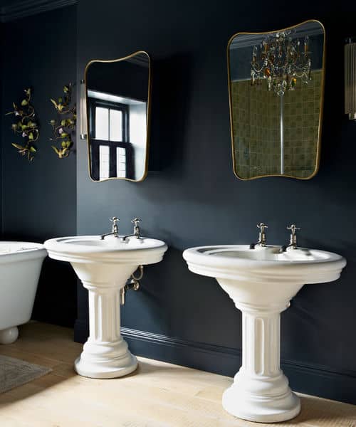 6. Commanding. Showstopping antique pedestal sinks stand out against this bathroom’s deep blue walls. This setup inspires a clean and close shave, impeccable makeup and confidence-building affirmations while looking in the mirror.