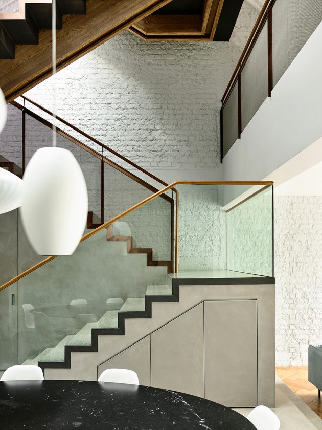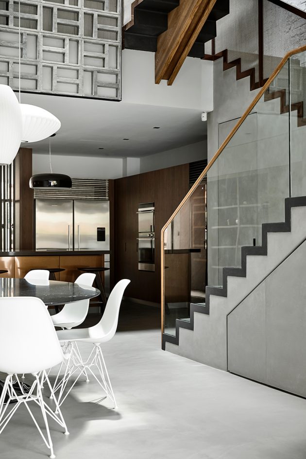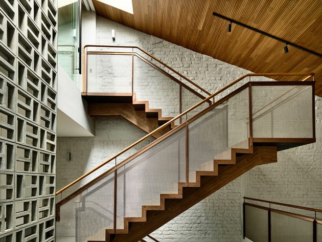 Architects elected to treat the structure conservatively, working to ensure that 80ADR-House remained a low-rise inter-terrace house. To accentuate the height of the internal spaces, the centre of the second floor was removed and rejoined on one side with thick glass floor panels. Two bedrooms sit towards the rear of the house, with a foyer area fronting a third bedroom and balcony area that faces the street. The centrepiece of the upper floors is an intricate breeze blocks façade that extends across the second and third storey, tracing its way to a large skylight that cascades light into the interior spaces. The home’s original white brick walls were also retained, providing a counter point to the mesh lined stairwell that leads to the master bedroom on the uppermost floor.