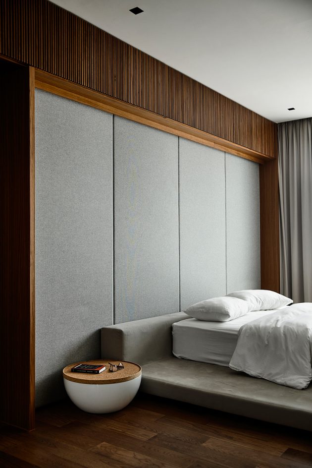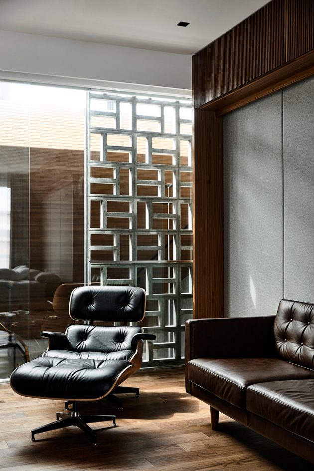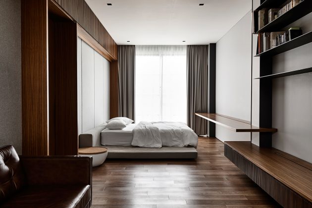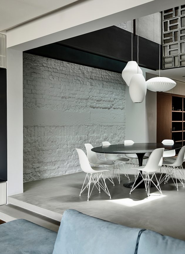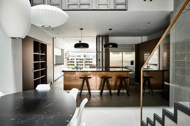 The highlight of the home is the master bedroom which overlooks the backyard garden and the surrounding neighbourhood beyond. Separating the main bedroom area from the bathroom and walk-in wardrobe is an inventive mirror system that can be adjusted to cordon off the different areas. Concealed sliding doors provide added privacy to the extended master bathroom, which is defined by hexagon-cut marble floors in grey and reverse white. The final design also includes a combined balcony space sitting just outside the master bedroom. Here architects implemented flexibility through a black spiral staircase that leads to a newly introduced rooftop area.