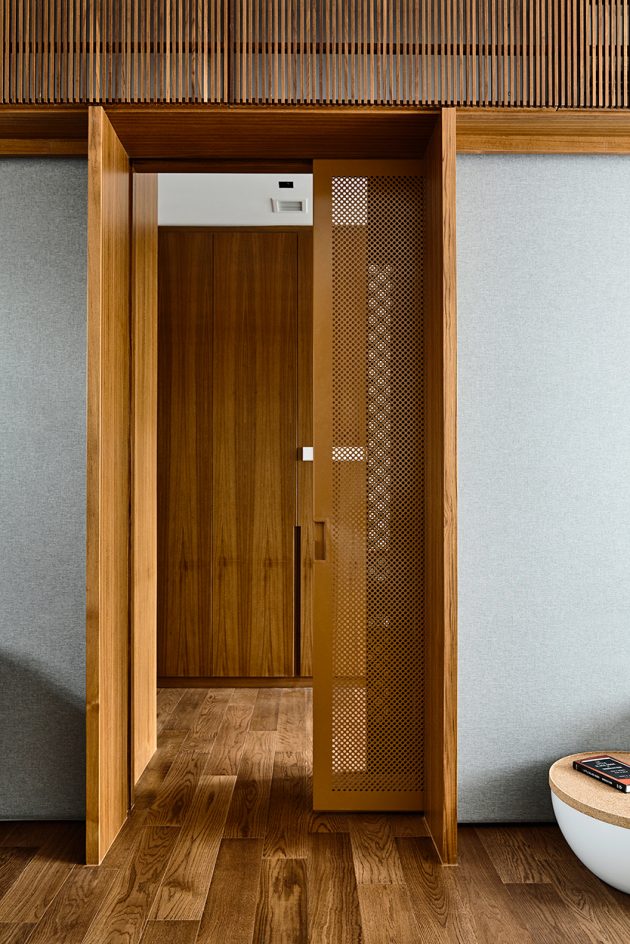 Behind a wood-strip front gate, a grain specked pebble driveway leads into the first floor of the home. Lined to one side by a compact garden area, the focus of the entranceway is a transplanted frangipani tree that spreads across the green space. Inside the house, oak flooring in a herringbone formation lines the main living room area. An open floor plan flows into the kitchen and dining space that has been fitted with an array of modern appliances. Retained elements on the ground floor include classic tiles, along with a wet kitchen and back washroom. These classic features are complimented by an abundance of bronze tonalities interspersed throughout the space.