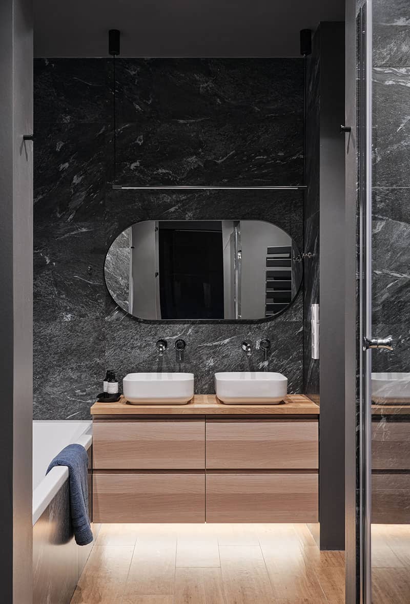 The dark colors are very elegant in the bathrooms. Here, the black marble is highlighted thanks to the light wood cabinet and the two white basins. We like the mirror with rounded edges, which modernizes the room!