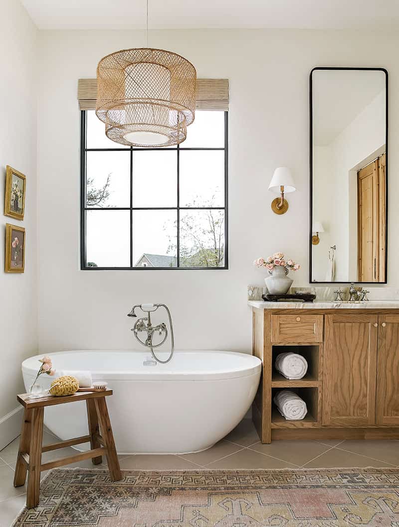 Decorating enthusiasts are not immune to the charm of a lion’s foot bathtub. Its little retro side sublimates all styles of decoration, as in this bathroom, with a style that is both ethnic and minimalist.