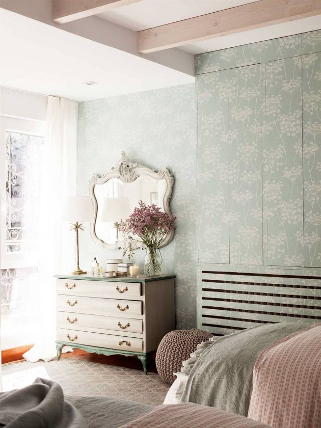 This chest of drawers has been reinvented thanks to the color inspired by wallpaper. It has been painted in white, like the flowers on the wallpaper, and the legs and the top have been stained aqua green, like the base of the paper.