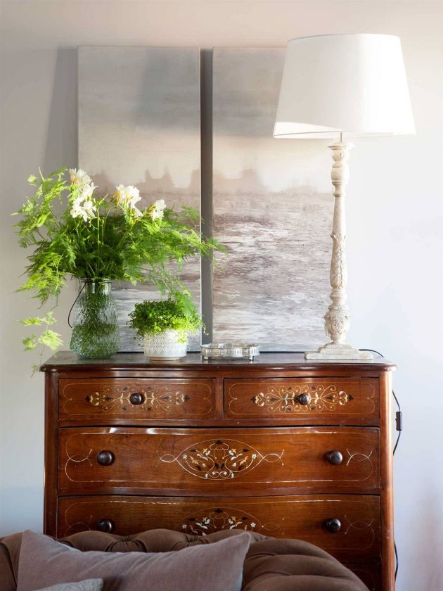 This dresser is almost a piece of art. It is a handmade marquetry chest of drawers that stands out for its carved front and decorated with painted motifs. If you have such a piece, find a special place at home and show it off!