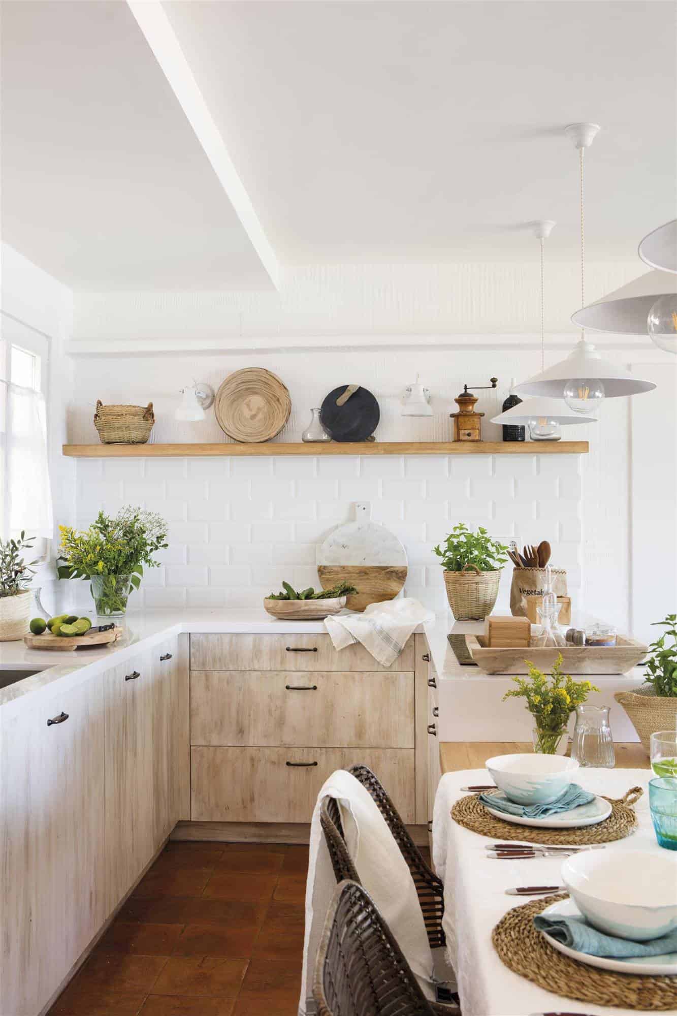 With furniture without doors, showing the interior, the kitchen will look a lot big because it will gain depth. But it will force you to keep them organized so it doesn’t look messy. The trick to avoiding chaos? Opt for fiber baskets or curtains, which give an extra country touch. If you choose them with color, they will give life to the kitchen.
