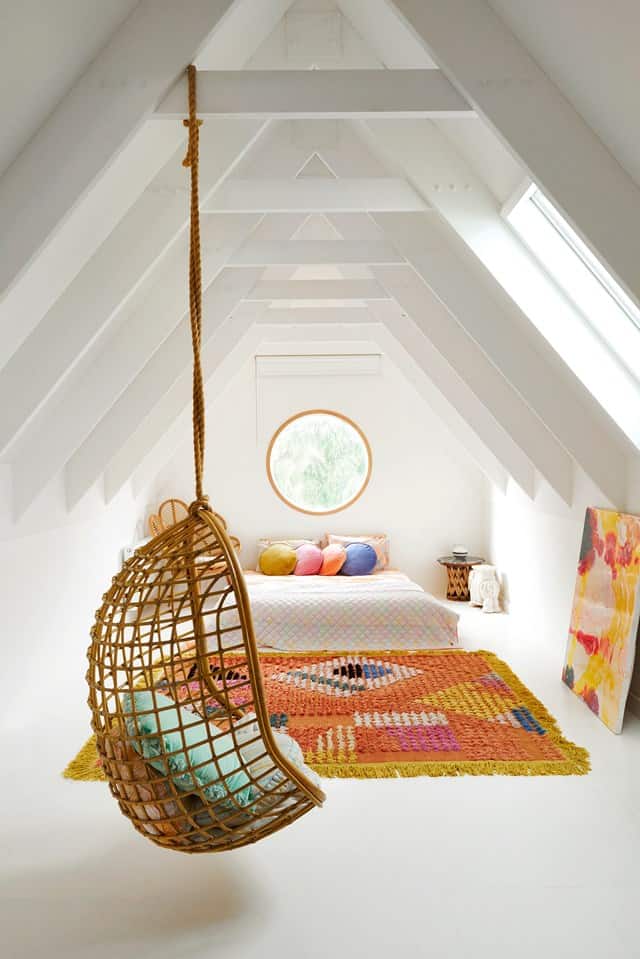 If you thought that boho style always features clashing patterns and colors, you are wrong. In this bohemian room the wood paneling adds texture and tone against that pure white back-drop. Fantastic vibe, agree?