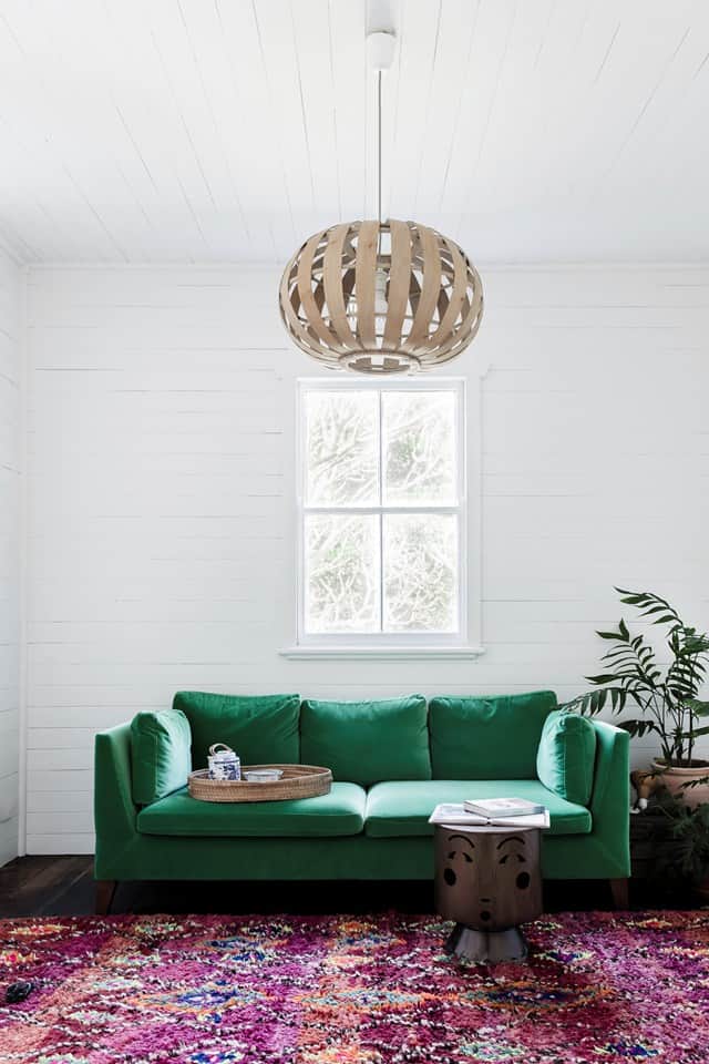 Come on! Look at the pattern, look at the color that have made a total transformation to this 70s beach shack into a rustic & boho retreat. This home is already unique with this mix of styles, and this mix of salvaged, contemporary and vintage furniture makes it even more.