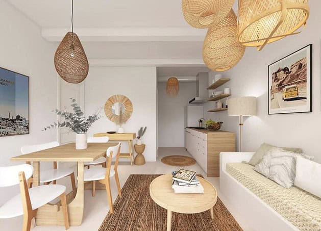 This as well as the interior of gives way to a minimalist style combining a bohemian and oceanic atmosphere where each element is worked with care to accentuate this impression of escape. Wood, rattan which are the essential materials for the bohemian style, light colors since white is not synonymous with emptiness but rather a symbol of purity, and finally beautiful suspensions to harmonize this atmosphere. It is important to cultivate a relaxing atmosphere to obtain a haven of peace.