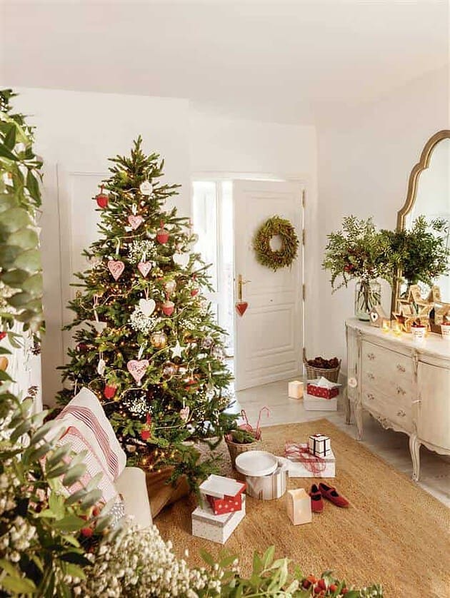 Upon entering this house we are surprised not only by its decoration, natural and full of life but also by its perfume. It is given off by the baby blue eucalyptus which, intertwined with the mastic, decorates every corner of the hall. Eucalyptus is perfect for Christmas because of its appearance and its perfume. Besides, it stays fresh for a couple of weeks and when it dries, it does not lose leaves or fruit. Its white decoration made them choose the small white flower of the paniculata to mix with the green branches in a garland that runs along the railing of the staircase. And to give it a more Christmas look, they added reddish rose flowers. How did they assemble it? With a wire to which the branches were strung with green ties and ropes. And to accompany it, pineapples, candles, glass balls, and white and light wood ornaments.It is not essential to decorate the tones of all the arrangements with the decoration. Play because nature is full of colors! and everything combines!