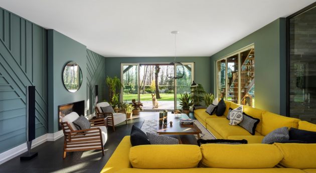 This time, the focus was on warming up this over-modernized, remote house, and creating a connection with its surrounding habitat, while still preserving the urban connection. To create a bond between the house and the garden (plus the forest) and bring them closer to each other. In addition to the existing whites and anthracites all around the house, it was aimed for a bit more elegant colors, textures, and furniture for a more sophisticated feeling in the main living room, while going for a more cozy, warm feeling in the garden level.