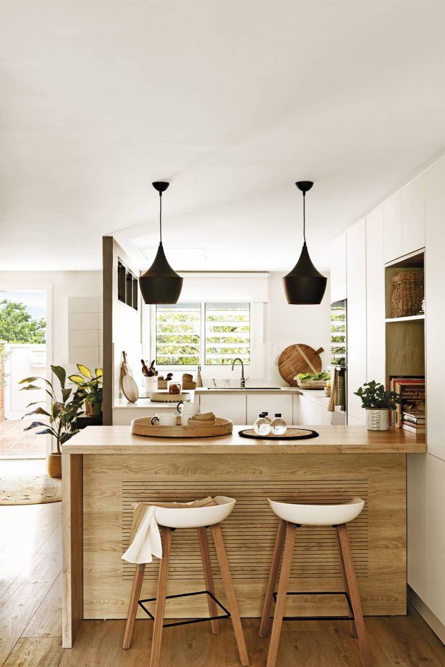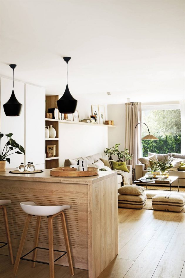 The bar is a sculptural piece of veneered wood that has a double function, although one of them remains hidden from view. It separates the kitchen from the living room and hides the heating. A two in one with a lot of styles.