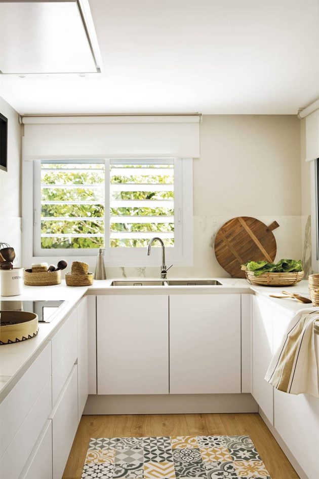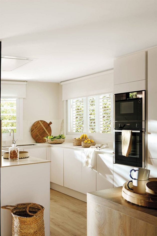 The first action of the decorator was to open the kitchen to enjoy a diaphanous and more practical day area to live with the family. By knocking down the partitions, the entire main floor has gained a wonderful light, because now it circulates from side to side of the house. By changing the ground, that the previous one was dark, the light explosion effect was reinforced.