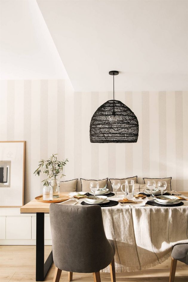 The dining room space has been framed with a striped wallpaper in stone and beige that goes from wall to wall, integrating this space into the day area and, at the same time, giving it its own personality. Once again here the decorator resorted to touches of black to give contrast: the lamp, the upholstered chairs, the iron frame of the table.