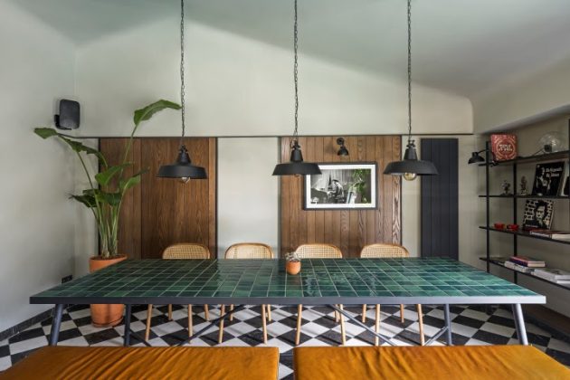 Familiar materials that will age with grace, but not get worn out. Belonging to their atmosphere as if they had been there for ages. So much belonging to its surrounding, so that caused a neighbor to comment “so lovely of you to keep the original floor tiles”, for the totally newly applied black and white checkered marble flooring.
