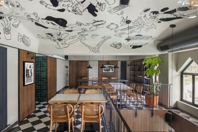 The visual narration drawn up by Piknik Works is custom designed for Cross Fingers Etiler’s ceiling and takes its characters, and story from Cross Fingers own world. Taking the highest spot of the ceiling as the center point, referencing the medieval ceiling murals, but with the 21st-century characters and stories, the narration is formed in a spiral form suitable for the vaulted ceiling.