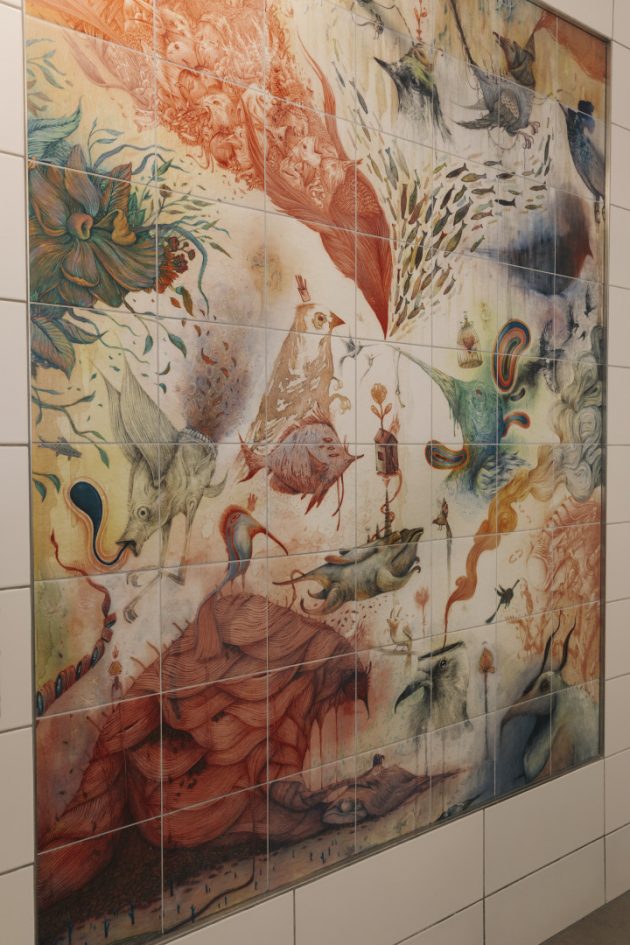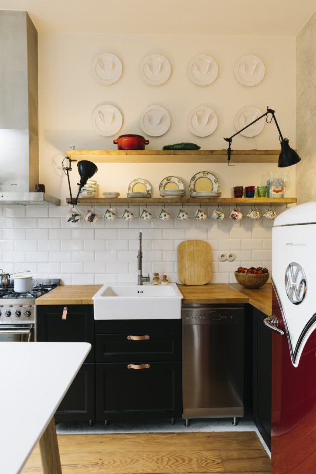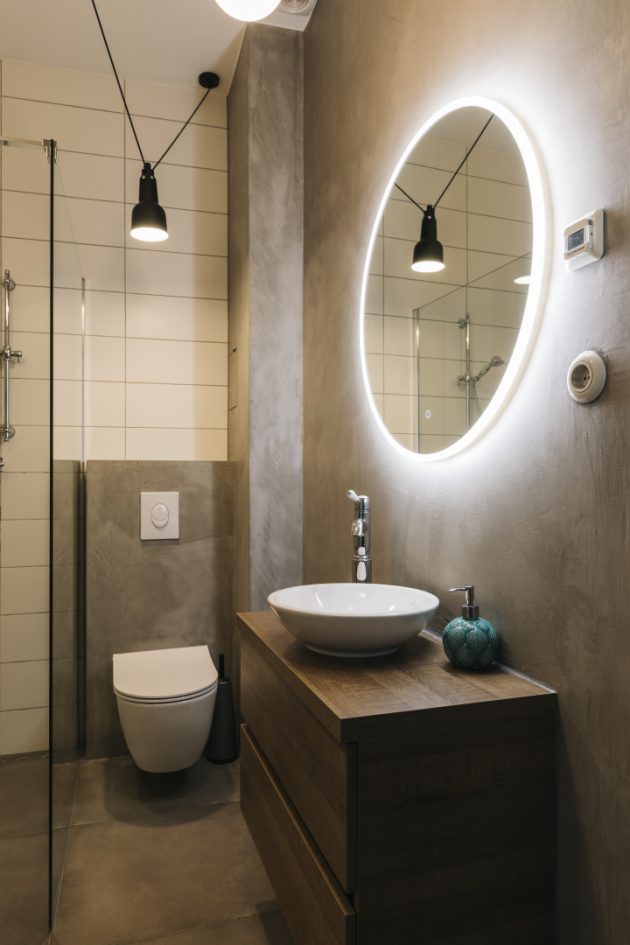 The bathroom was surfaced with micro topping around the center point illustration ‘’Insomnia’’ by Vorja Sanchez printed on white ceramic tiles. In connection with the living room, the kitchen was designed to be a part of the daily life, acting as a dining space, a study area, or a coffee corner when needed. With little storage and more naked walls, decorated with ‘’Petite Friture Curiosity’’ plates with bunny ears.