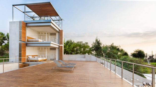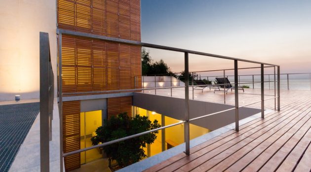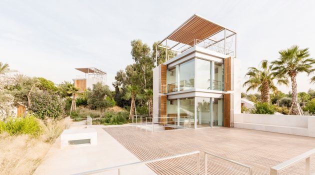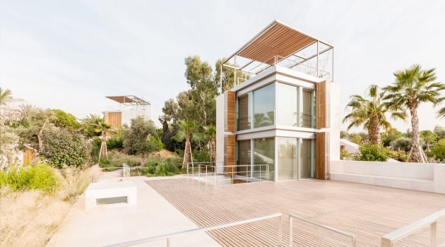The Aamchit Courtowers is a housing complex on the coast of Aamchit in Lebanon which features bedrooms contained withing towers protected by folding shutters and sliding glass walls that allow sea breezes to cool the interiors.