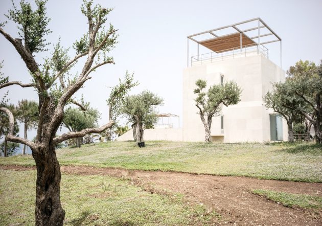 The Courtowers were designed by the Beirut-based architecture office Hashim Sarkis Studios. The project is a cluster of four family properties on a plot facing the Mediterranean Sea. Each of these buildings features a solid base containing the living areas, which is set into the sloping site and provides a plinth for a tower hosing the bedrooms.