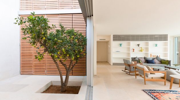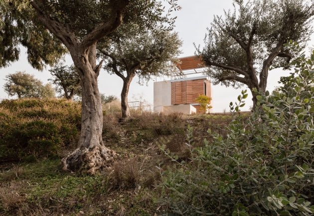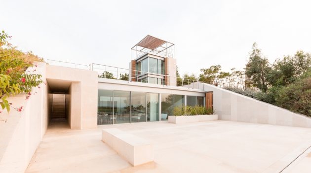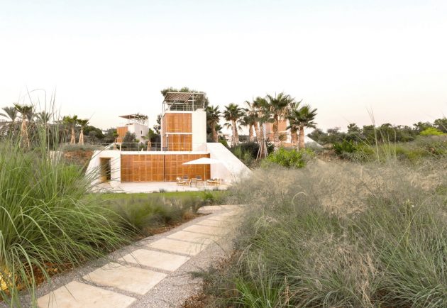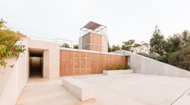 The site slopes west towards the Mediterranean, its angle allowing for embedding the houses in the landscape in such a way that the front is open to the view and breeze whereas the other sides of the house are protected by earth. Each house consists of a double-layer wall that retains the earth from the east and slopes with the land north and south.”