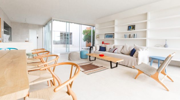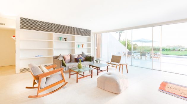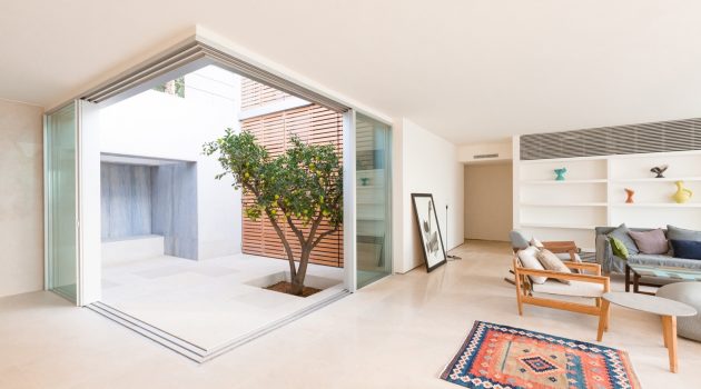 “The framing/retaining wall is doubled to create insulation and service passage against the soil’s humidity and to draw in cool air into the house. The double perimeter wall also works as a structure and is used for all the services of the house, leaving the ground floor open. A courtyard is inserted in the back to enhance cross ventilation and create a microclimate in the extreme days of summer and winter.”