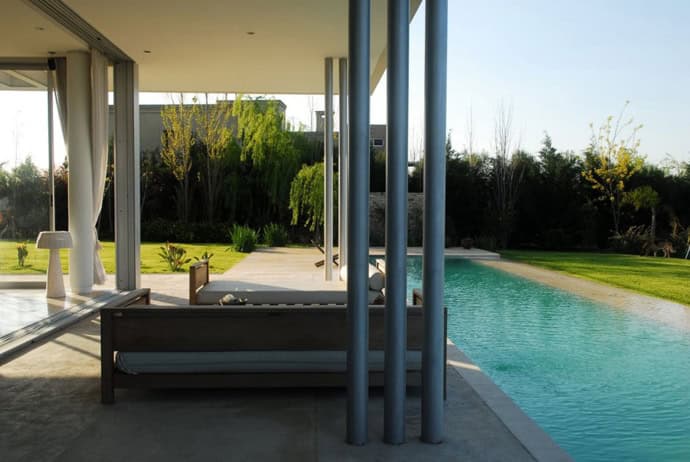 A large swimming pool stretches across the property, reinforcing horizontal lines.
