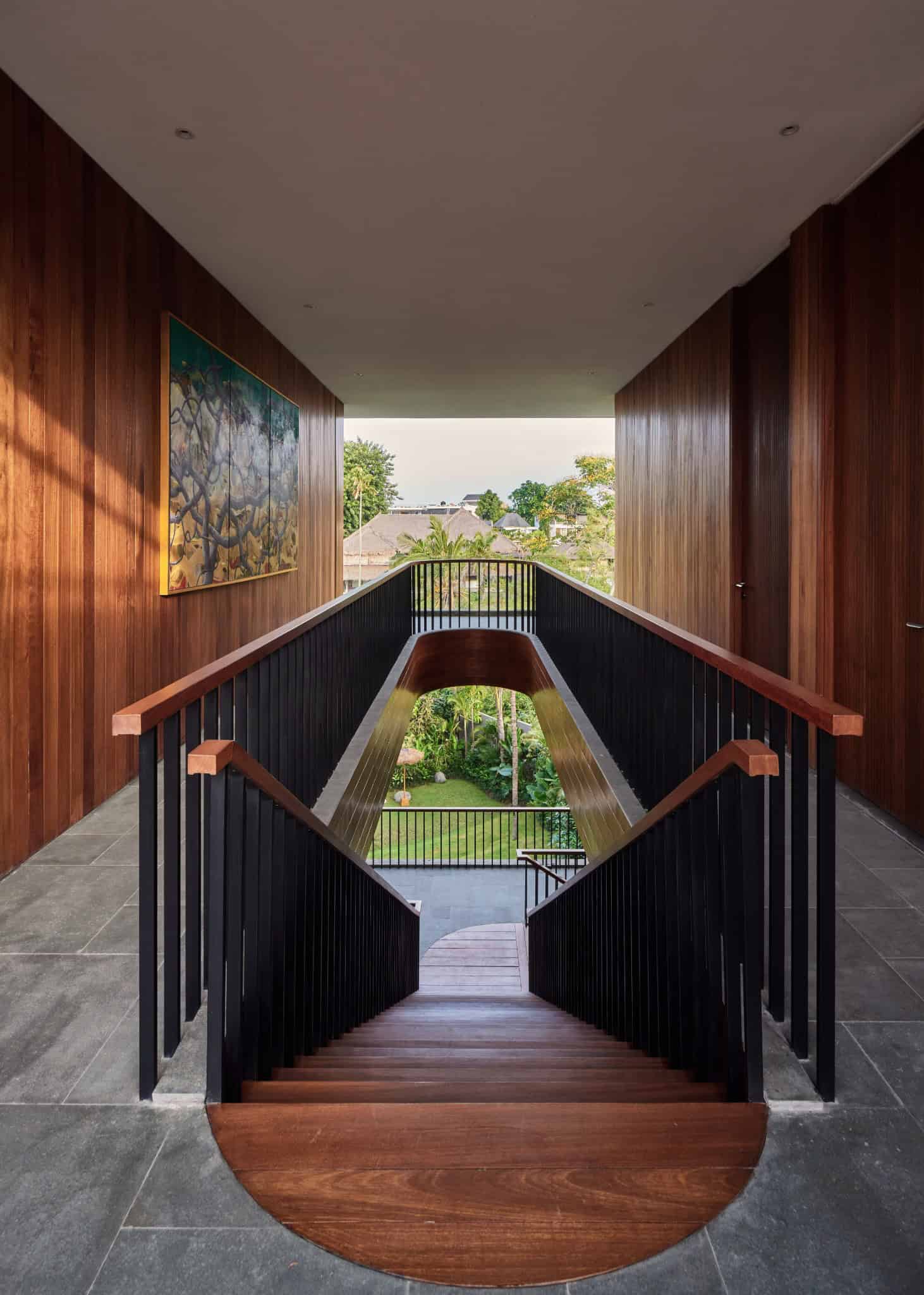 Modern hallway with wood and black rail staircase overlooking tropical garden. Photography © KIE