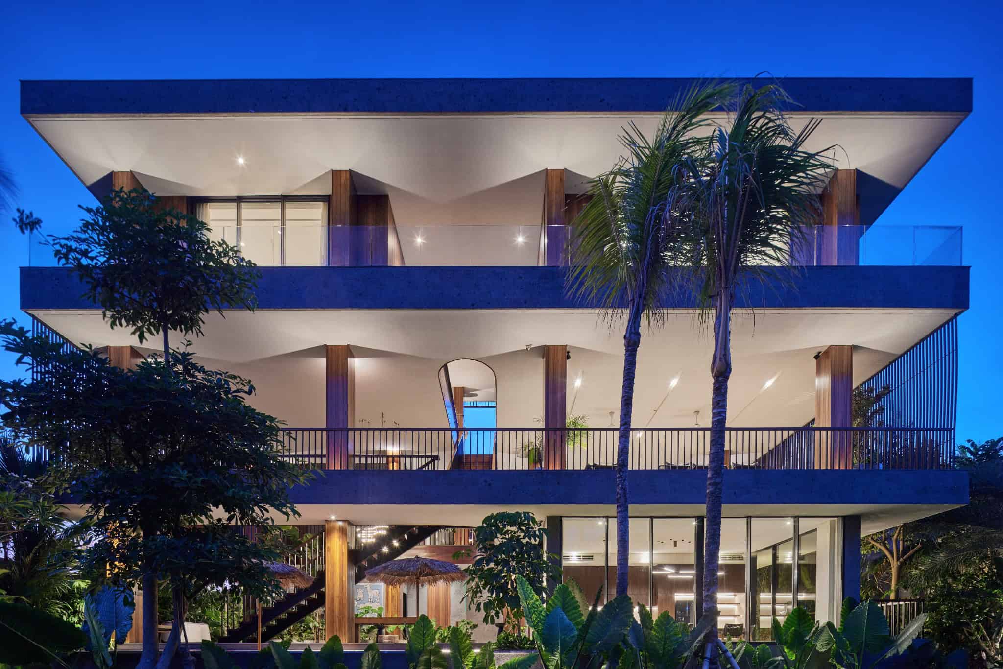 Minimalist three-story villa exterior lit up at night in a tropical setting.