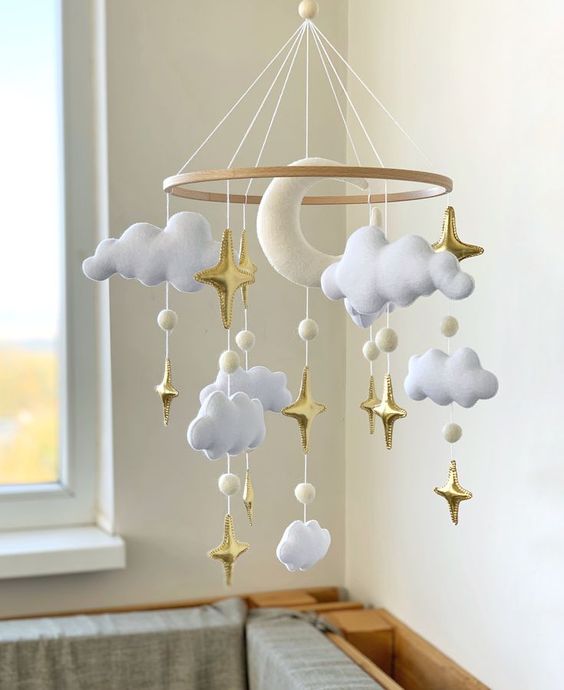 Another component that can be used to incorporate the cloud concept into the bedroom is the mobile. The coolest thing about this is that you can make the piece yourself using paper, crochet, or even little felt clouds.