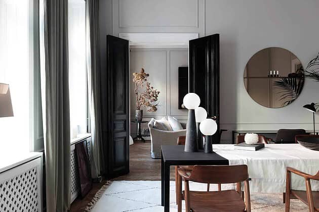 Access to the dining room is through a double door. A black wooden table is enthroned on a Berber-style carpet, and walnut chairs paired with a tinted mirror immediately add warmth.