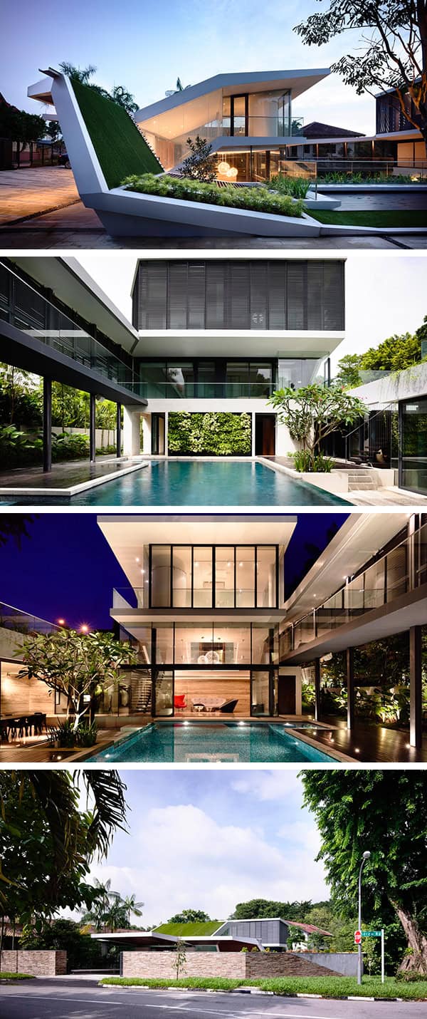 From the architects: “As is the case in many countries, Singapore’s residential architecture can no longer rely on idyllic sites and spectacular views to inform its spaces. The scarcity of land for private houses has led to a reality of less-than-perfect plots. Although surrounded by heavy greenery along the perimeter of one of the nation’s mature nature reserves, this house is also situated at a major vehicular intersection along a busy and noisy highway.