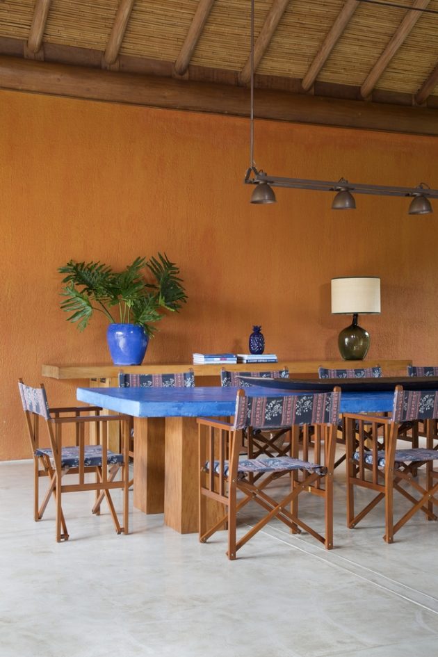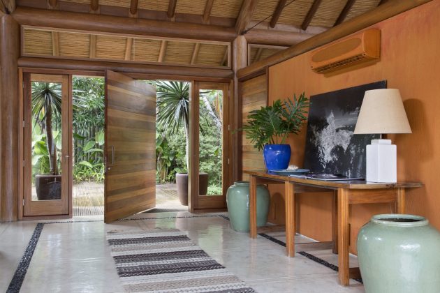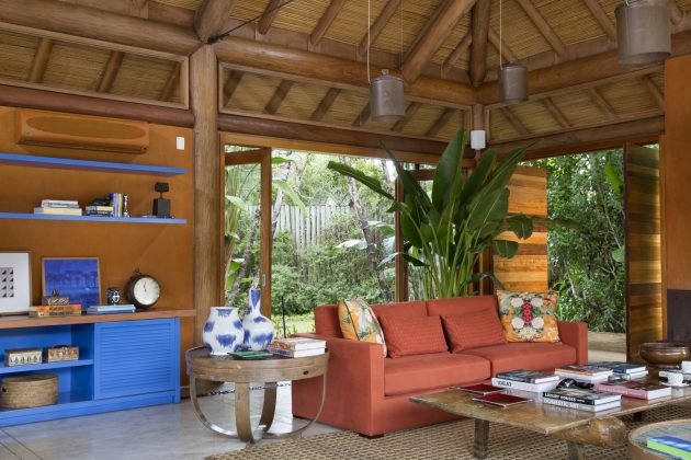 Aesthetically, the architecture resembles a hut. Wood brings the feeling of something less built, more natural and organic. Rounded pequiá wood logs structure the roof, while the walls are lined with alternately narrow and wide boards and autoclaved pine boards cover the roofs.