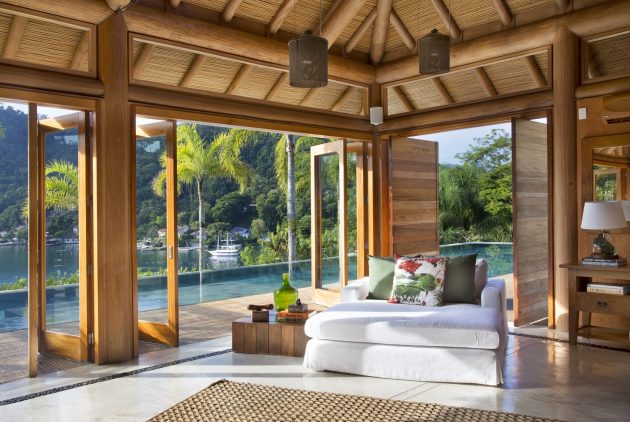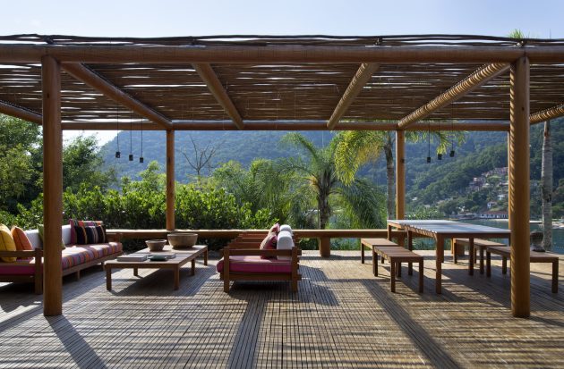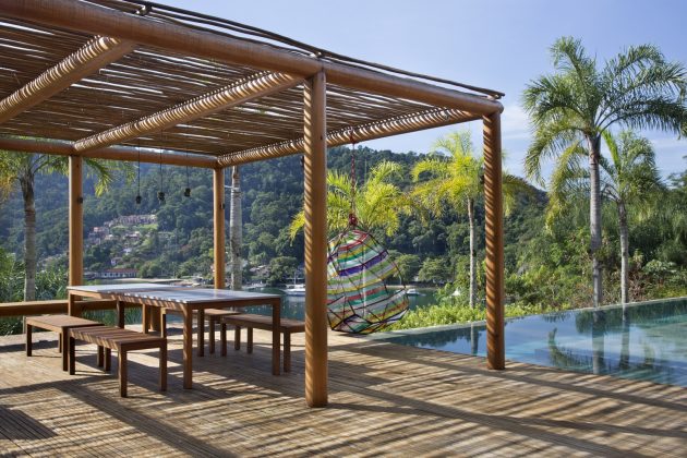 The Angra dos Reis House in Brazil is a 13,993 sf home designed by Cadas Arquitetura for a large family. The steep land has a beautiful view of the sea and the house design consists of several small blocks instead of one large volume. The interior and exterior areas are integrated, with a large square pool area and garden under a wooden deck.