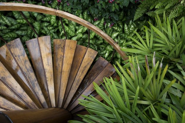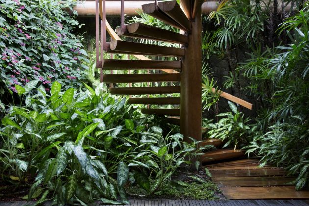 There is a large square around the pool, where the buildings converge. This allowed to create a garden and a large free and leisure area mounted under the wooden deck.  This area is totally integrated with the dynamics of the house and can be accessed from a passage between the rooms or through a helical staircase that resembles a sculpture.