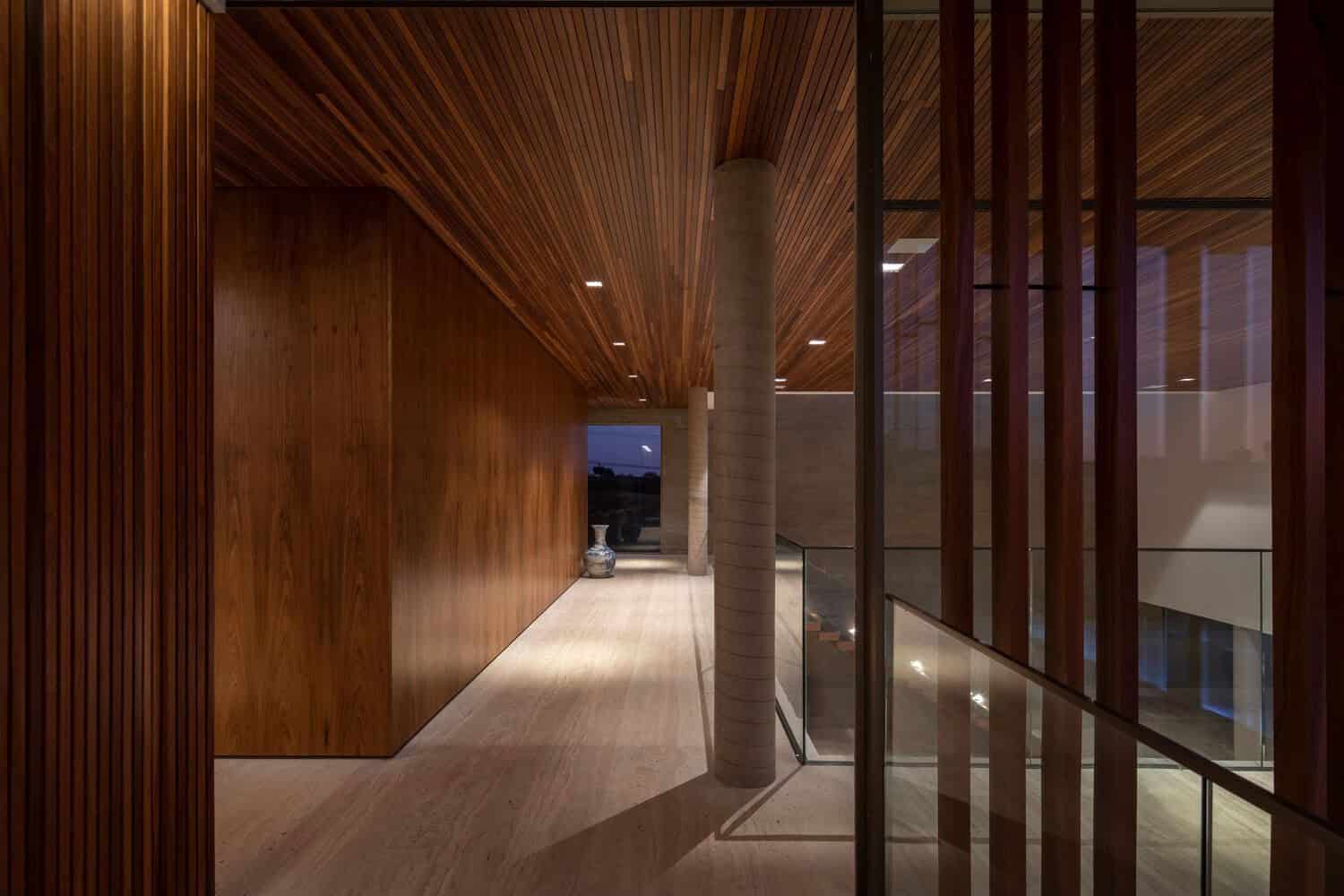 Upon entry, a grand hall on the first floor welcomes residents and visitors, leading into six private suites and establishing a strong division between intimate and communal zones. Floor-to-ceiling glazing and wooden brise-soleil slats filter natural light while preserving privacy, extending the rhythm of the façade into the interiors. Zenithal openings bring daylight into circulation areas, highlighting the sculptural staircase descending to the ground level.