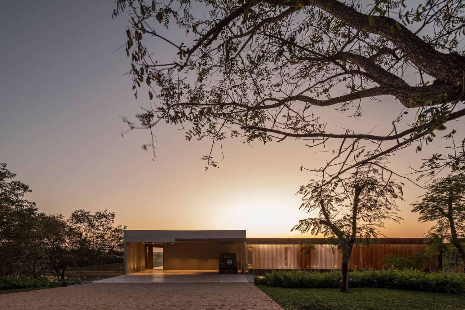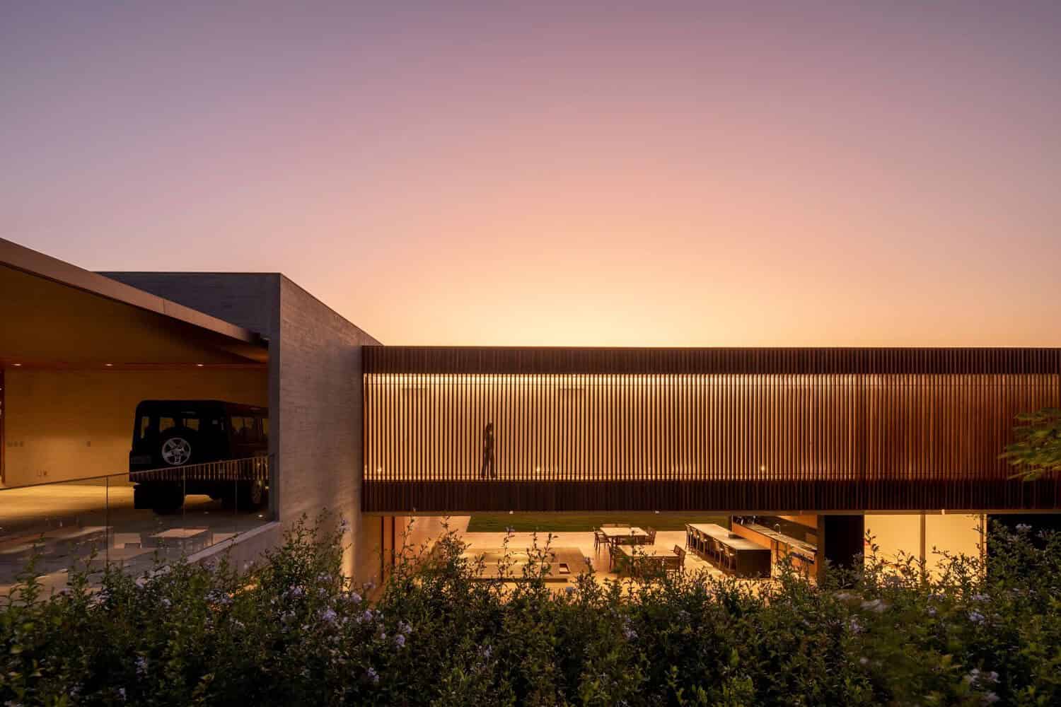Straight, modern lines contrast with the organic slopes of the terrain, creating a striking dialogue between built form and landscape. Organized in an L-shaped layout, the house strategically opens toward the interior of the lot, shielding residents from distractions while directing views toward the expansive scenery.