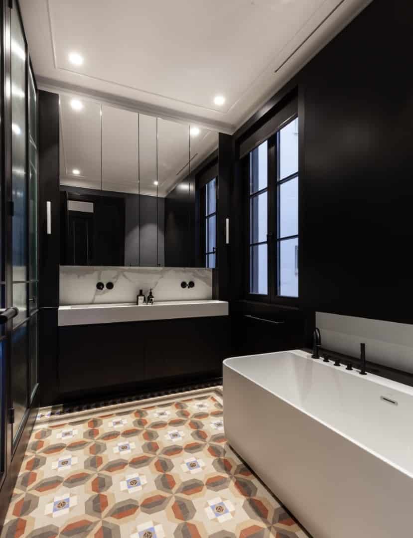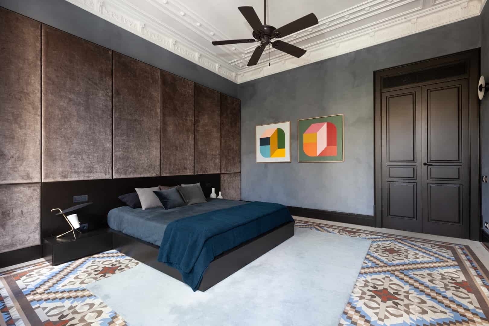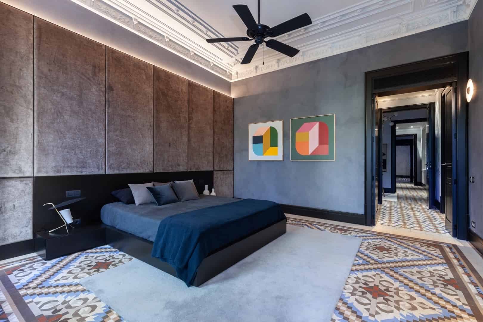 Luxurious bedroom interior with dark walls, elegant ceiling moldings, large windows with black shutters, modern furniture, and patterned tiled flooring for stylish architectural design.